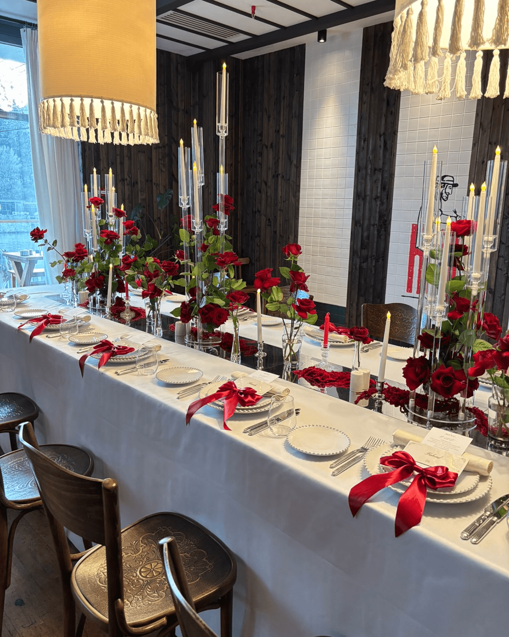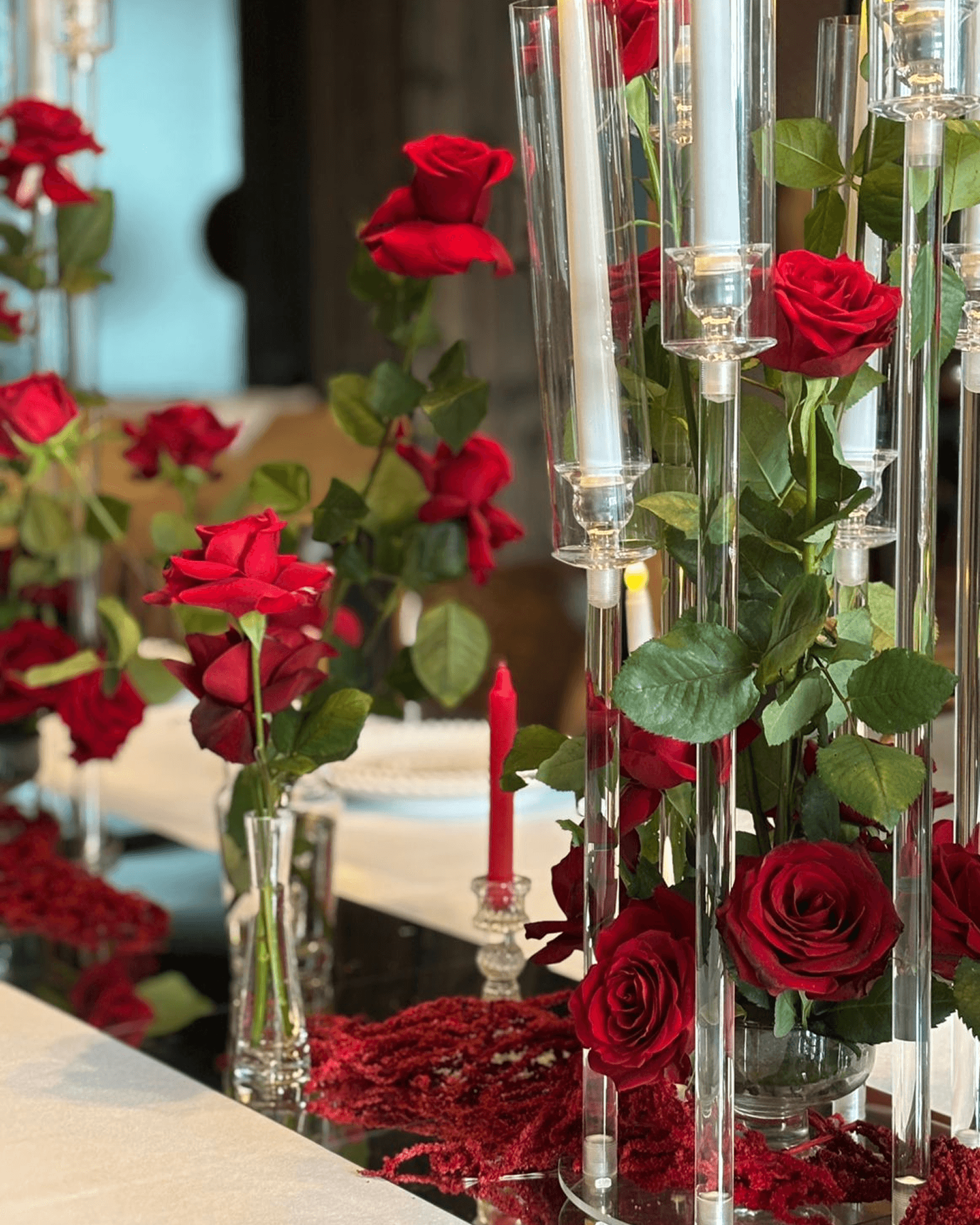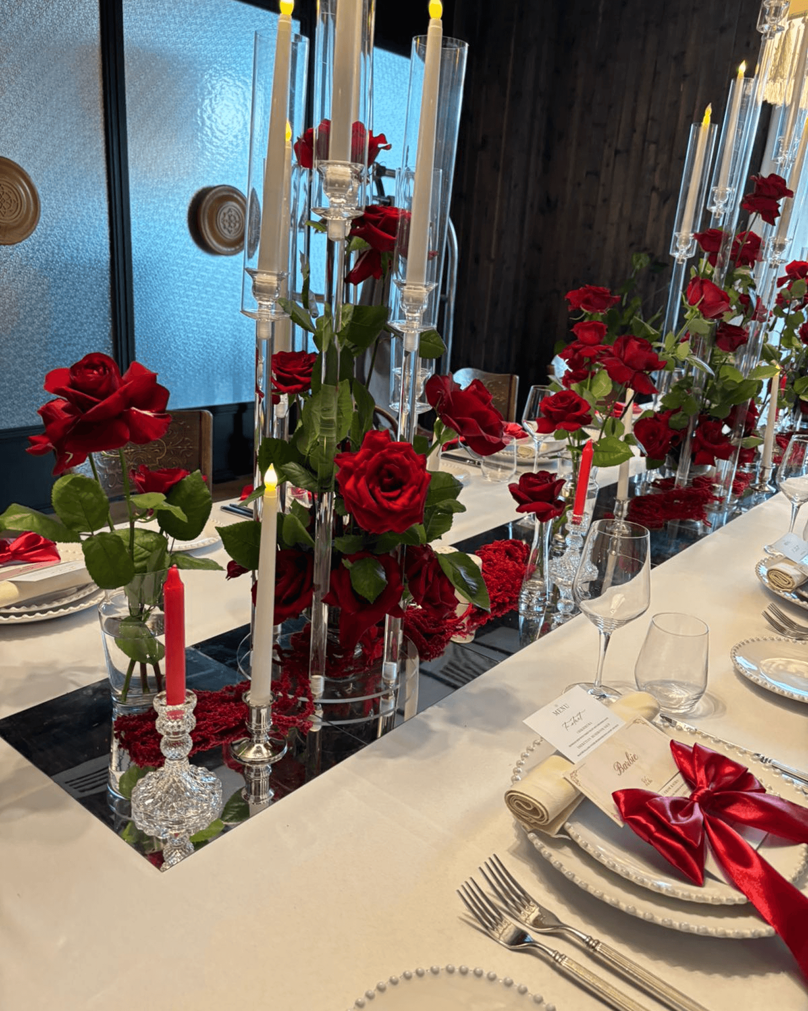 A romantic banquet-style wedding setup featuring a long head table with elegant white linens, red rose centerpieces, tall glass candleholders, ambient pendant lighting, coordinated place settings with ribbon accents, and an intimate, candlelit dining atmosphere.