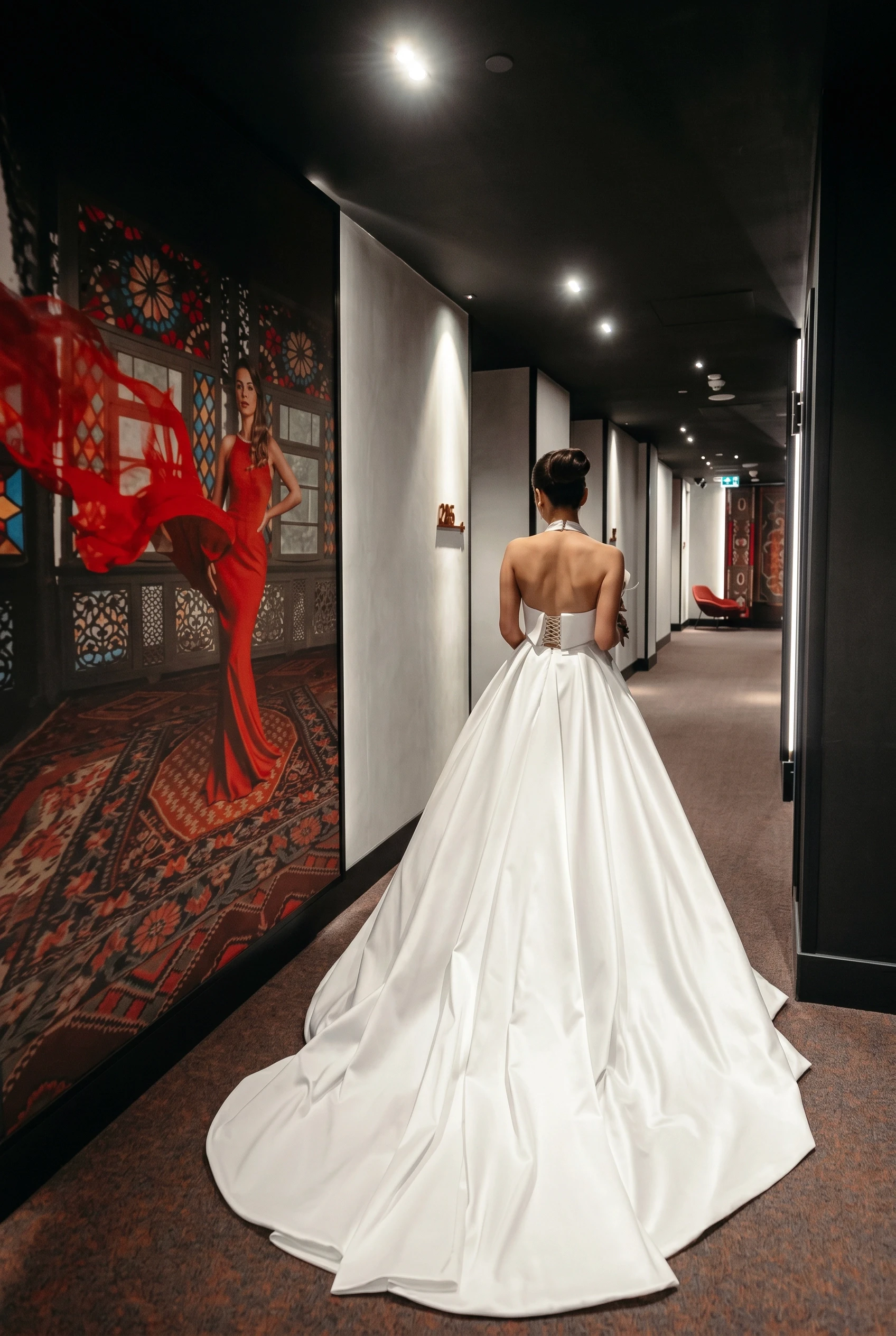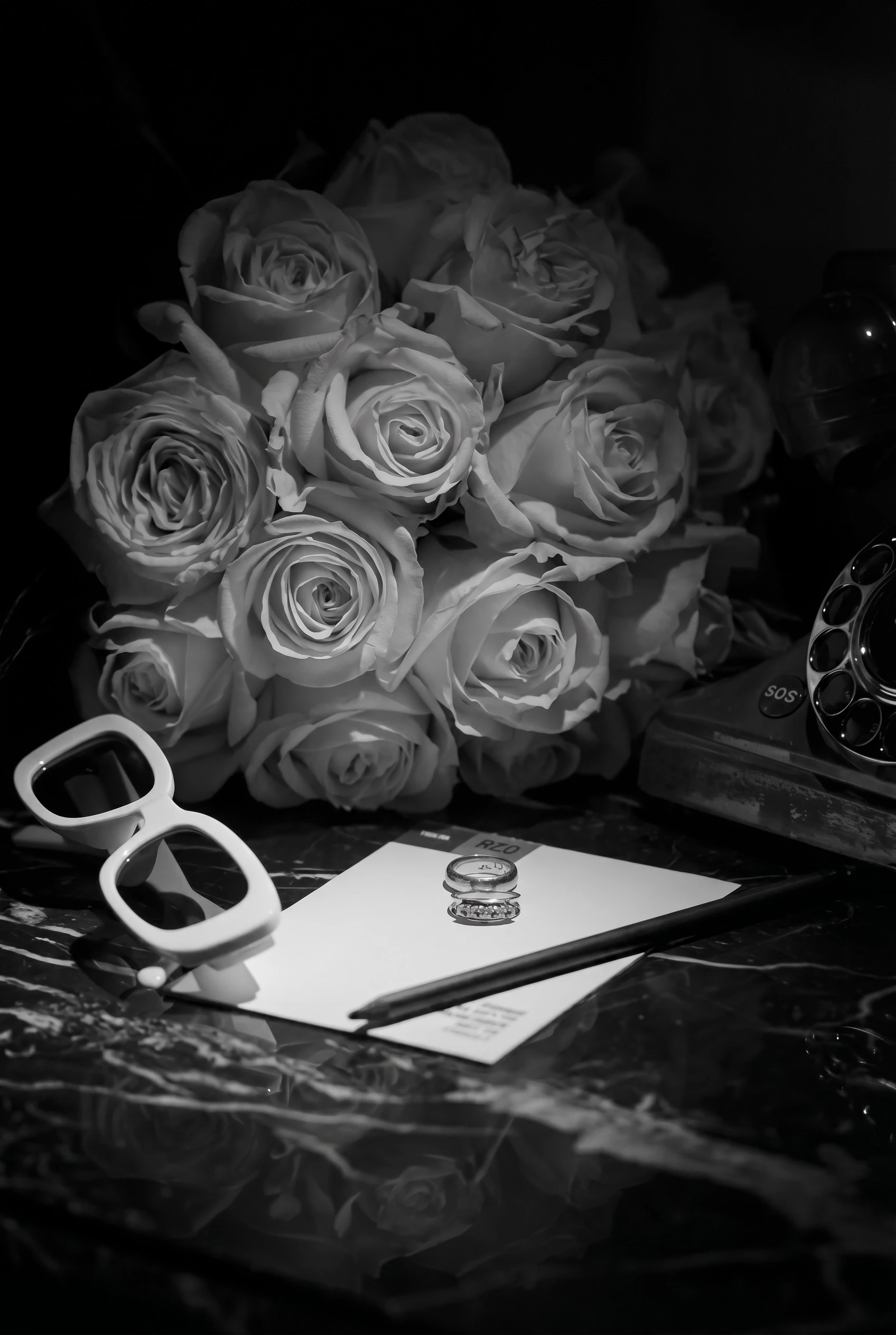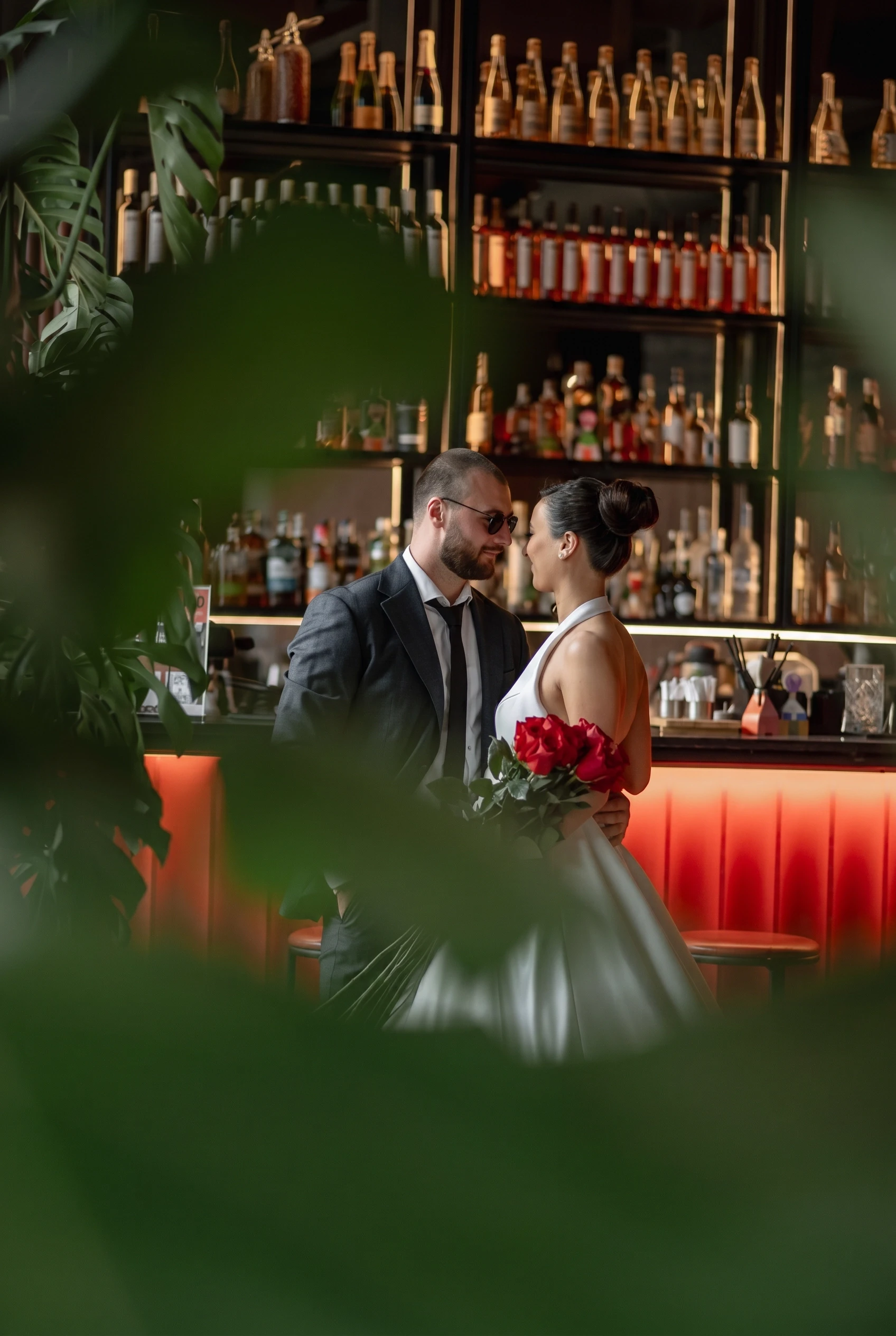 A romantic banquet-style wedding setup featuring a long head table with elegant white linens, red rose centerpieces, tall glass candleholders, ambient pendant lighting, coordinated place settings with ribbon accents, and an intimate, candlelit dining atmosphere.