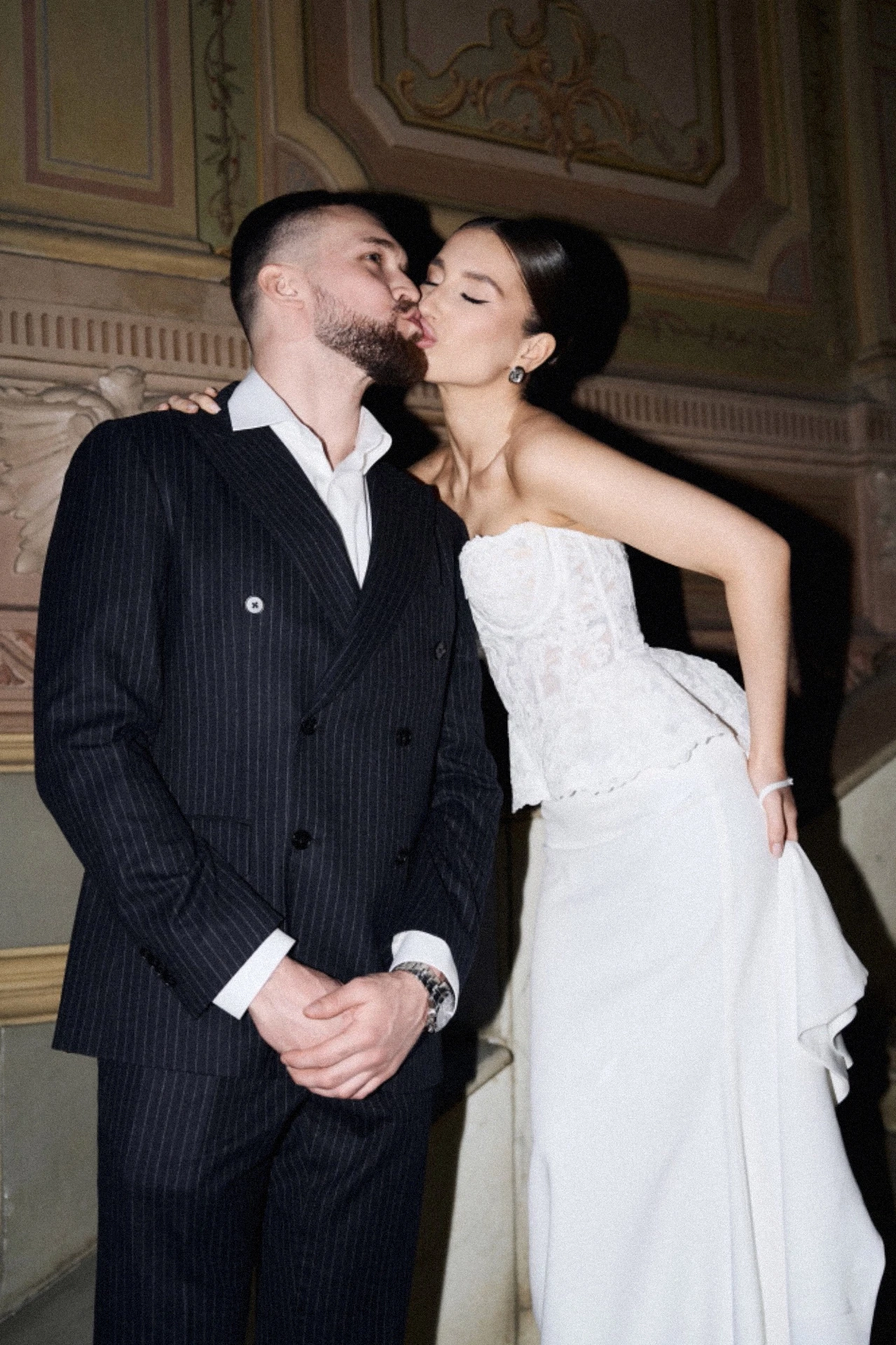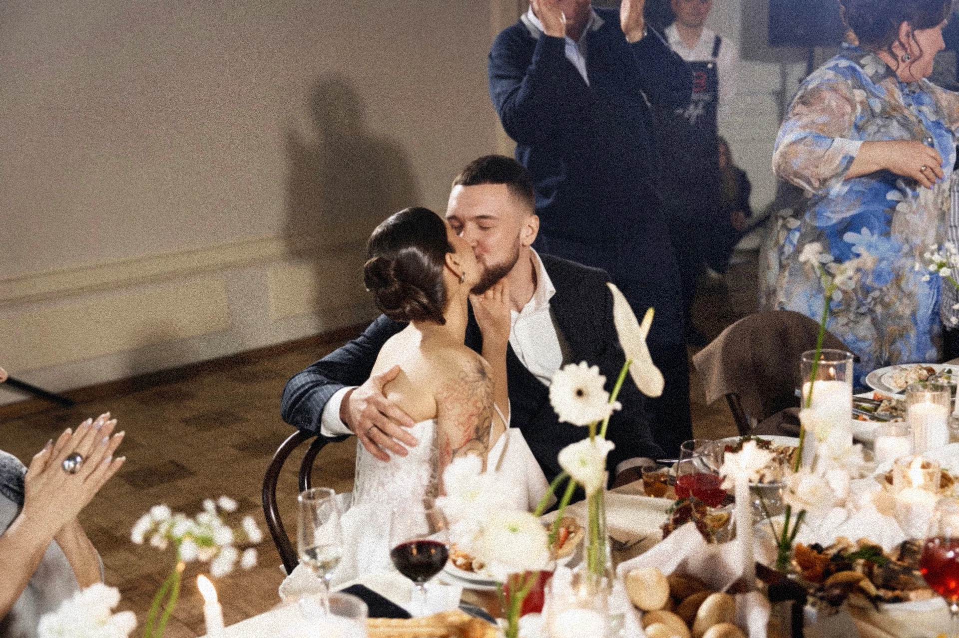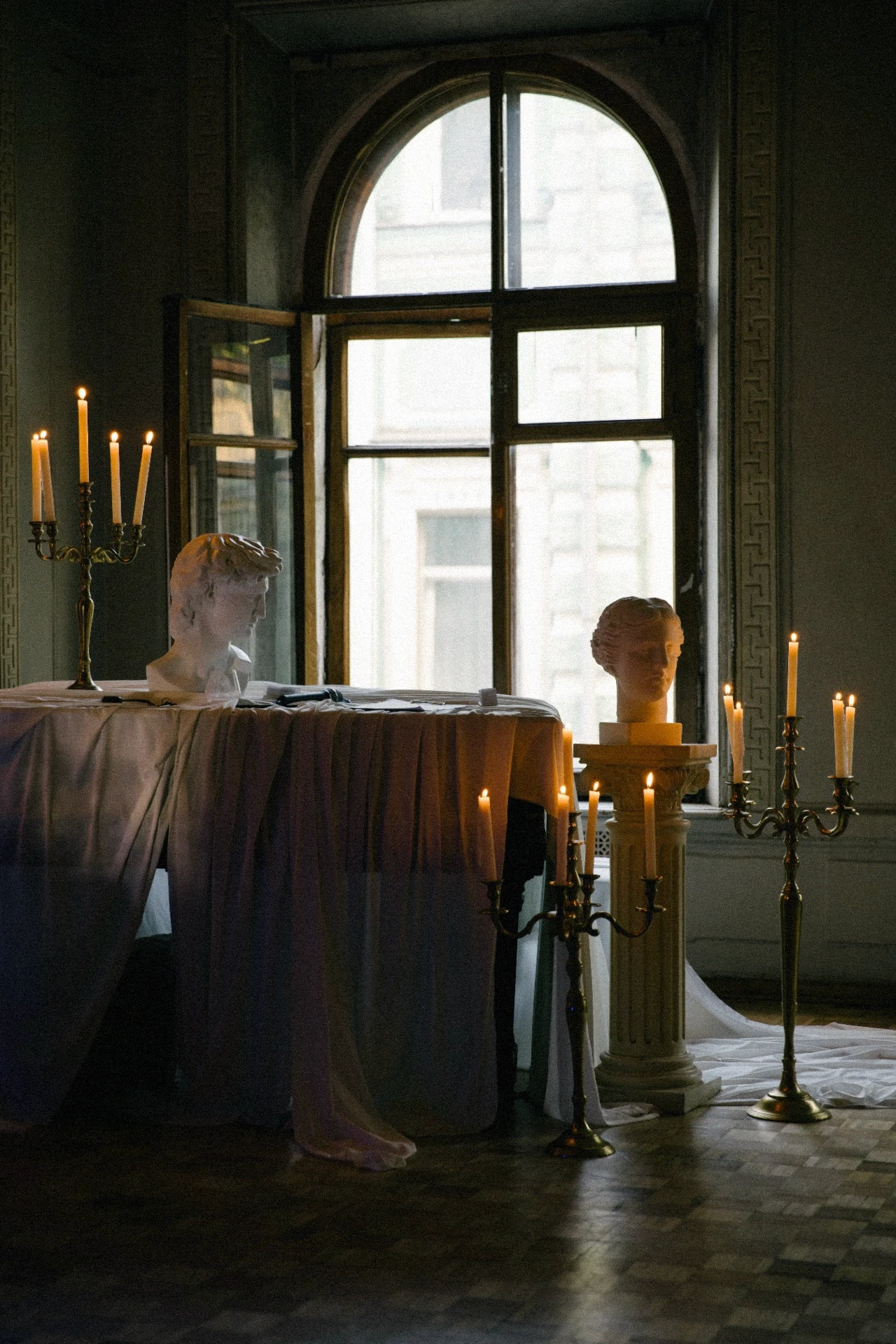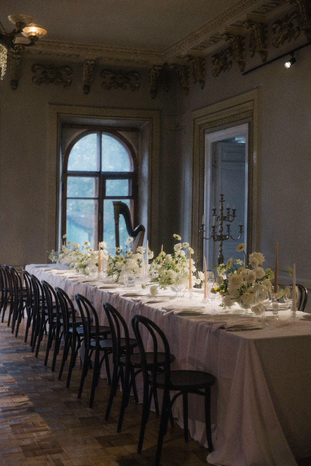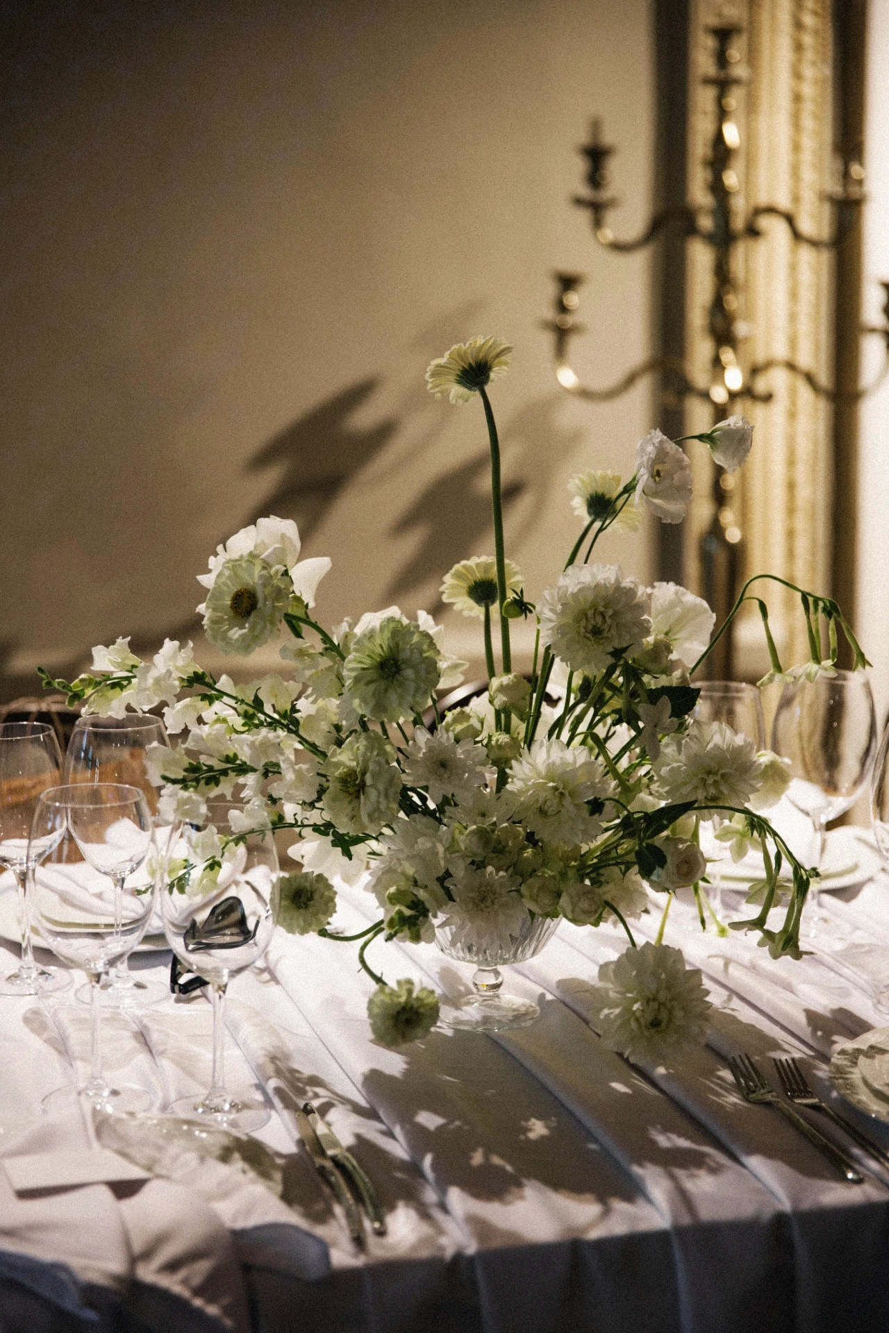 ცერემონიის სივრცე სანთლებითა და სკულპტურული ელემენტებით, გრძელი სტუმრის მაგიდები თეთრი ყვავილოვანი კომპოზიციებით, კლასიკური სანთლები, დახვეწილი ტექსტილები.